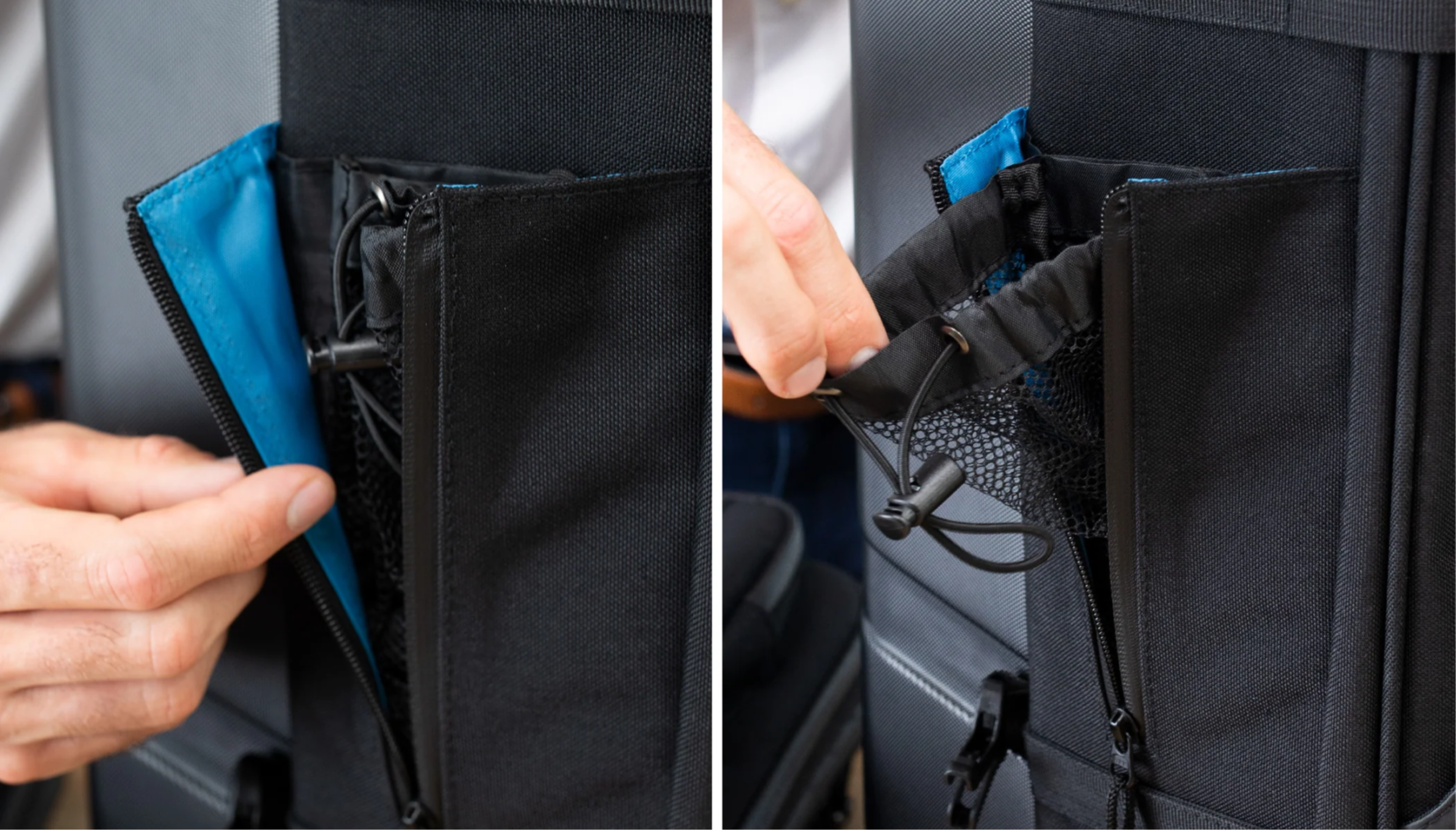 Spacious top pocket offers ample room for travel documents, phone, adapters, 3-1-1 toiletry bags, and even a tablet.